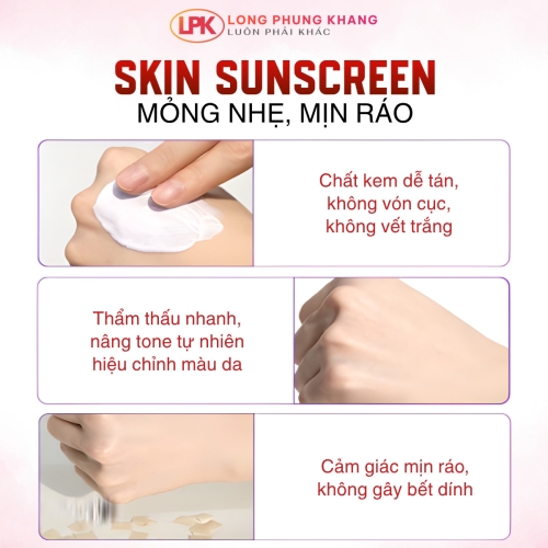 Kem Chống Nắng của nhà Long Phụng Khang giúp làm mát và dịu da khi tiếp xúc nhiều với ánh mặt trời, cùng phương pháp ch ống tia UV hi ện đ ại nhất, sẽ bảo vệ làn làn da khỏi bụi mịn và các tác nhân ô nhiễm bên ngoài. Ngoài ra còn hỗ trợ nâng tone, làm đều màu da...