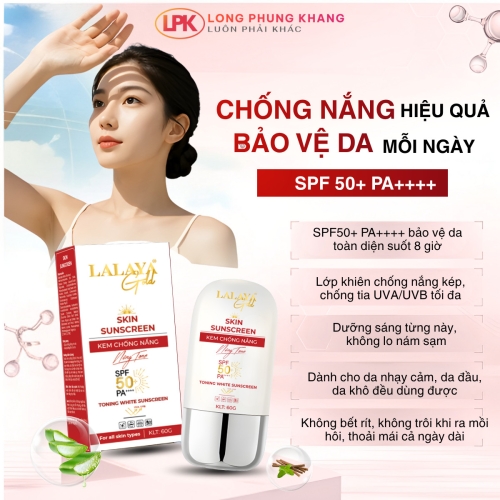 Kem Chống Nắng LALAYA Gold SPF50+/PA++++ với công thức độc quyền tạo khiên chắn tia UVA/UVB hiệu quả của Titanium Dioxide và Zinc Oxide với gấp đôi dưỡng chất tự nhiên giả m sự hình thành nám, sạm và da nhạ y cảm. Bảo vệ da khỏi ánh nắng với kết cấu mỏng nhẹ, khô thoáng, không gây bết dính tạo lớp nền hoàn hảo cho làn da.