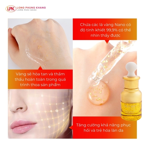 - Tinh chất gold 24K kích thích sản sinh collagen, thúc đẩy khả năng miễn dịch cho da, giúp chậm quá trình lão hóa da và tái tạo làn da, trả lại sự tươi trẻ và độ đàn hồi.