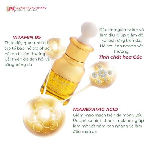 - Thành phần: Glycerin, Vitamin B3, Vitamin E, Tranexamic Acid, Bisaolol,...